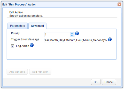The %TriggerErrorMessage% variable, on the other hand, holds (as you might have probably guessed correctly) the trigger error message passed by the Run Process trigger action to this trigger. If you recall, we specified this message earlier when we edited the contents of the Run Process action's Advanced tab.