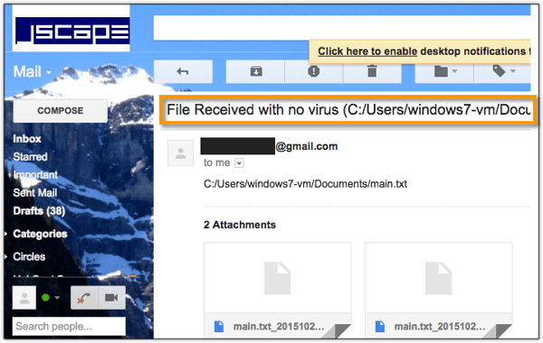Keeping that in mind, we can set up our managed file transfer server so that it would send us two types of emails - one that reports a virus detection and one that reports of a clean upload.