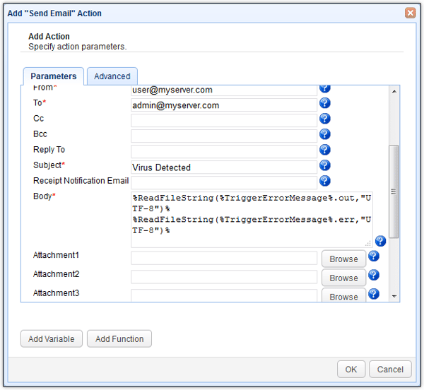 To include the contents of our output and error streams as attachments, we simply entered the following into the attachment fields.
