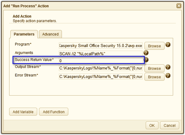 The big question is, what's the criteria for the action to be considered a "failure"? If we recall the Run Process action parameters, there's a field there that's labeled "Success Return Value". We set that value to zero (0), which is normally the return value that indicates that a command line execution was a success.