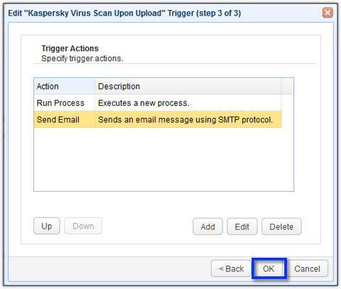 That's it. After you finalize this trigger, your server should then be capable of sending email notifications after an upload file virus scan.