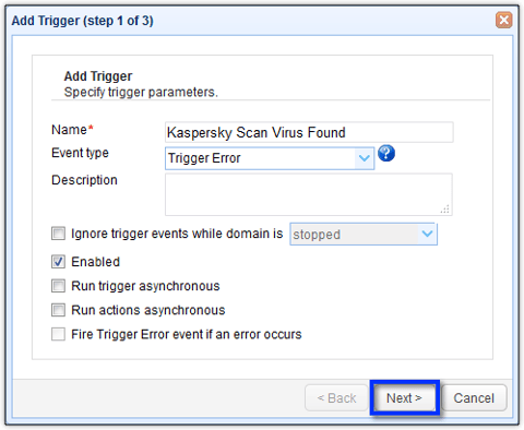 Now it's time to create that second trigger. Create a new trigger and give it a descriptive name. For example, "Kaspersky Scan Virus Found". Because this trigger should be fired only if the first trigger raises a trigger error event, we select the Trigger Error event type.