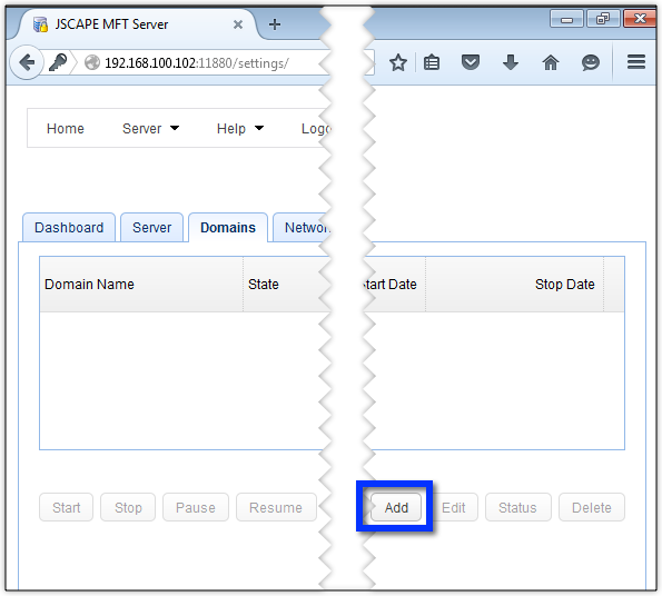 JSCAPE MFT Server will allow you to create multiple domains. Your SFTP service will be running on a domain, so let's create a domain first. Just click the Add button.