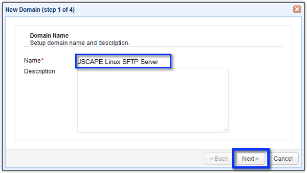 Give the domain a descriptive name (e.g. "JSCAPE Linux SFTP Server") and then click Next.