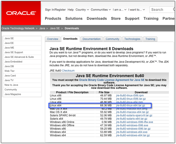 Download files for the latest version of the JRE from Oracle here. Follow the instructions on the screen. You'll want to download the tar.gz file for Linux. As of this writing, the latest version of Ubuntu Server, which is the one we're using, is 14.04.3 LTS (Long Term Support). Since it's a 64-bit OS, we'll need to download the 64-bit version of the JRE.
