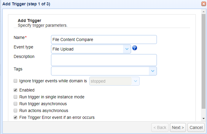 Now login into admin console of JSCAPE MFT Server > Triggers and Click Add to create a Trigger. Give the trigger a Name and then select the File Upload event type from the drop-down list.