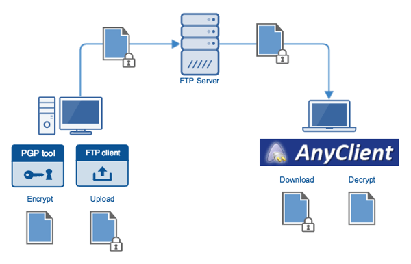 A file uploaded using an encrypted file transfer protocol like FTPS, SFTP, or HTTPS, auto-encrypted with OpenPGP on the server, and then downloaded over FTP using AnyClient. The upload doesn't have to be PGP-encrypted since those secure file transfer protocols already support data-in-motion encryption. The downloaded, however, which will be carried out over FTP, has to be PGP-encrypted.